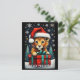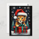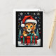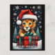 Un lindo león bebé con un Sombrero de Santa y un regalo de Navidades en la nevada postal de fondo.