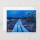 Vista panorámica de la ciudad de bog por la noche con sendero de madera, pequeños estanques y pinos. Camino de senderismo con pasarela de madera que atraviesa el pantano contra luna llena y cielo nocturno con estrellas.