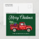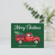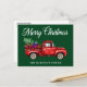 Una hermosa postal navideña con un guión moderno de caligrafía Feliz Navidad y tu nombre familiar personalizado con un camión rojo de color acuático cargado con un árbol de Navidad y regalos para todos.