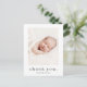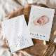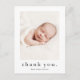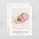 Una simple tarjeta de agradecimiento para bebé de fotos con un tipo moderno y una foto en el frente. La parte trasera es una postal que se puede enviar por correo con un encabezado de nombre completo grande y un mensaje personal de la familia. Haga clic en el botón de edición para personalizar este diseño con sus fotos y detalles.