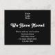 Esta postal de invitación móvil tiene un texto blanco que puede personalizar. Esta postal negra dice que nos hemos mudado, por favor visite nuestra nueva ubicación. Se pueden personalizar líneas de texto adicionales para el nombre de su empresa, la nueva dirección y el número de teléfono. Una imagen de marcador de posición está cerca de la parte superior. Puede sustituir la imagen por el logotipo de su empresa,