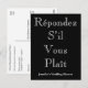 Este nostálgico diseño de postales RSVP incluye el mensaje "Répondez S’il Vous Plaît" en la parte delantera, junto con el nombre de un evento de personalizable. También incluye un formulario RSVP de personalizable en la parte posterior para que el destinatario lo complete, junto con una dirección de personalizable a la que se enviarán por correo las tarjetas RSVP completadas. Tarjetas RSVP como esta podrían ser usadas para averiguar quién asistirá a un fiesta de retiro, una ducha de matrimonio, una fiesta de graduación, un fiesta de Navidades o alguna otra celebración.