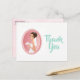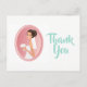 Una ducha de novia gracias a una postal con un ilustracion de una novia sonriente sosteniendo un ramo de flores con su vestido de boda blanco y elegante y llevando un velo. Se coloca dentro de un marco ovalado rosado con un borde de vieira.