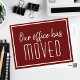 Tenemos una nueva postal de domiciliación móvil para una empresa de negocios o moda moderna que busca actualizar a sus clientes en una nueva ubicación. Nuestra oficina se ha mudado. Tipografía clásica y minimalista sobre tarjetas rojas y blancas para tu empresa. Personalizar el cambio de dirección en la parte posterior.