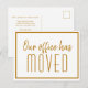 Contamos con una nueva tarjeta postal móvil de dirección para una empresa de negocios o moda moderna que busca actualizar a sus clientes en una nueva ubicación. Nuestra oficina se ha mudado. Tipografía elegante y minimalista en postales elegantes en blanco y oro para tu empresa. Personalizar el cambio de dirección en la parte posterior.