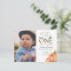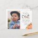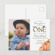 Nuestra pequeña calabaza, bosque, invitación de tarjeta postal para el primer cumpleaños de otoño. Lindos animales del bosque pintados con acuarela rodean un "uno" limpio y audaz con detalles de calabaza en acuarela. Los colores suaves naranja y verde acentúan esta fiesta de primer cumpleaños de otoño. Perfecto para el tema de otoño del primer cumpleaños del bebé. Personalice con el nombre de su pequeño y estará listo para organizar la fiesta de "Nuestra pequeña calabaza está cumpliendo un año". Asegúrese de obtener todos los suministros para la fiesta con este tema de diseño en la Colección de Primer Cumpleaños de Nuestra Pequeña Calabaza y Animales del Bosque en la tienda de The Gathering Designs.