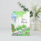 Una conmovedora postal de invitación decorada con una tranquila cabaña con pasarela de adoquín y flores coloridas en flor dibujadas a mano con tinta y acuarela. Agradable para que la familia, los amigos y los clientes conozcan su nueva dirección.