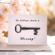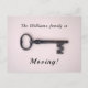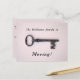 Muestra una clave de esqueleto antigua sobre un fondo rosado. El texto principal dice "¡La familia Williams se está mudando!" y se puede personalizar. La información de contacto de la parte posterior puede cambiarse a su nueva dirección. Diseño minimalista, limpio y femenino. Para mudarse a un nuevo hogar, con su nueva dirección, teléfono, número y otra información de contacto.