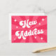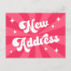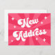 Nuevas tarjetas postales de invitación móviles de dirección con texto en blanco "Nueva dirección" en un divertido y retro tipo de letra rodeado de estrellas retro en un fondo de rotura de sol rosa. Añade tu nueva dirección en la parte posterior. El texto de atrás es personalizable.