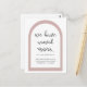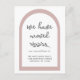 Invitación simple y en movimiento de moda con "hemos movido" escritura moderna, una rama botánica de color gris bonito, arco rosado de moda y nueva información de dirección.