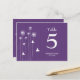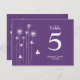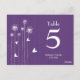 Esta elegante tarjeta postal boda de moda tiene un fondo de rayas moradas de ciruela oscura con mariposas blancas y un diseño floral a la izquierda. A la derecha, se puede personalizar fácilmente el número de la mesa junto con los nombres de la novia y el novio y la fecha de la ceremonia del boda. El diseño se repite al revés.