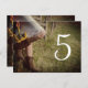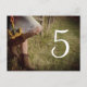 Los números de la mesa de Bodas occidentales de la zona rural de Cowgirl y Sunflowers, informales pero elegantes, se pueden personalizar para crear una tarjeta diferente para cada mesa en su granja rural o en la recepción de matrimonio con temas de rancho, fiesta de granero de compromiso o almuerzo de ducha de novia. Estas elegantes e informales tarjetas de números de mesa personalizado occidental presentan una pintoresca fotografía de una novia con un vestido de boda de encaje blanco y botas de vaquero de cuero marrón que llevan un ramo de girasoles amarillos apoyándose en una alambrada de alambre de madera templada con hierba verde.