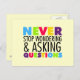 El brillante diseño de texto multicolor dice "Nunca dejen de hacer preguntas y maravillas" en camisetas de mensajes inspiradores, imanes, botones, bolsos de té, tarjetas, pegatinas, cadenas de llaves, tabletas, botellas de agua y mucho más. ¡Estos mensajes motivacionales son excelentes para los profesores y otros profesionales de la educación!