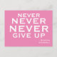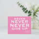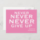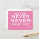 Postal motivacional con las palabras de Winston Churchill. Nunca, nunca, nunca rendirse. Postal rosa con tipografía blanca crujiente.