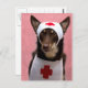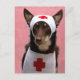 Otra linda foto en la serie de postales antropomórficas: Las aventuras de Aliado, el perro Kelpie australiano. Aquí está vestida como enfermera, con gorra y delantal con cruz roja. ¡No puede esperar a besarlo y mejorarlo! Foto de Louise Docker Browse de la serie Ally aquí com com com