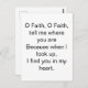 O Postal de citas Inspiradoras de fe diseñada por Nisha Prabhu. Este es mi poema original escrito por mí. ¡Presentamos la postal Inspiradora de la cita "O Faith"! Esta tarjeta postal está muy bien diseñada y es la manera perfecta de enviar algo de aliento e inspiración a sus seres queridos. La cita sirve como recordatorio de tener fe y confianza en el proceso, incluso cuando las cosas parecen inciertas o difíciles. Alienta al receptor a creer en el poder de los milagros y les recuerda que las cosas buenas pueden ocurrir incluso en medio de tiempos difíciles. En la parte posterior de la tarjeta postal, hay amplio espacio para escribir un mensaje sincero a su destinatario. Ya sea que envíes esta postal a un amigo, familiar o alguien que necesite un poco de positividad, tus palabras seguramente marcarán la diferencia en su día. Esparce esperanza e inspiración con la Inspiradora postal "O Faith". Es un pequeño gesto que tiene un gran impacto, recordando a los demás mantener su fe y creer en la magia de los milagros.