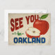 Una encantadora postal de viaje vintage de Oakland California que presenta una hermosa manzana roja, junto con un divertido texto de estilo retro que dice, "Nos vemos en Oakland"