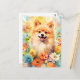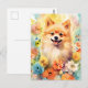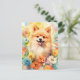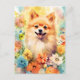 Acuarela colorida de un Pomerania sentado en un campo de flores de primavera.