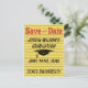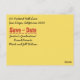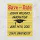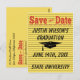 Moderno estilo de memo amarillo brillante, naranja y negro Guardar la postal de la fecha. El diseño incluye un gráfico negro de un gorra de graduación. Perfecto para anotar notas sobre tu graduación. ¡Enhorabuena!