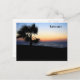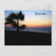 Esta postal de bonito muestra una fotografía de una palmera junto al océano al atardecer. El texto de la esquina superior derecha es el personalizable que se adapta a cualquier lugar tropical que se desee.