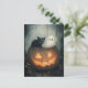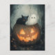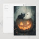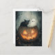 Una divertida escena de Halloween con un fantasma y un gato negro escondido dentro de una calabaza de faroles de Jack o