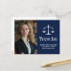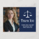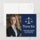 Elegantes tarjetas de agradecimiento de abogado azul marino con las balanzas de la justicia junto a su foto de graduación o oficina. Personalice estas tarjetas de agradecimiento de la facultad de derecho con elegante letra blanca junto a la fotografía de su abogado.