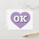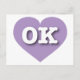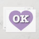 Esta tarjeta postal contiene un corazón suavizado y eslavo que contiene las letras negrita y blanca del funda superior OK, la abreviatura oficial de Oklahoma, el estado anterior. El lado inverso de la postal está en blanco, esperando tus sentimientos escritos a mano o texto personalizado. Elija el estilo de fuente, el tamaño y el color.