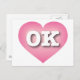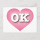 Esta postal tiene un corazón tranquilo, fresco y recogido de color rosa con un centro blanco lavado que contiene las letras negrita y blanca del funda superior OK, la abreviatura oficial de Oklahoma, el estado anterior. El lado inverso de la postal está en blanco, a la espera de tus sentimientos escritos a mano o de tu texto personalizado.