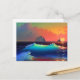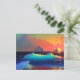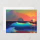Postal Olas Teales Etéreas, Barco y Atardecer Rosa