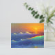 Postal Olas teñidas de azul celeste y puesta de sol naran
