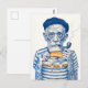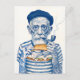 Illustration of an elderly sailor in a striped shirt smoking a pipe while holding a sandwich. Tattoos are visible on his arms, and maritime elements surround the character.