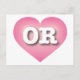 Esta postal presenta un corazón tranquilo, fresco y recogido de color rosa con un centro blanco lavado que contiene las letras en negrita blancas altas del funda OR, la abreviatura oficial del estado de Oregón, el estado castor. El lado inverso de la postal está en blanco, a la espera de tus sentimientos escritos a mano o de tu texto personalizado.