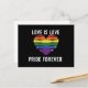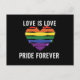 El centro cuenta con un corazón estilizado, lleno de rayas de arco iris, rodeado de una luz suave y brillante. Encima del corazón está la frase "El amor es el amor" en una fuente moderna y limpia con sutiles gradientes de arco iris. Debajo, "Orgullo por siempre" está escrito en negrita en blanco con una textura ligeramente angustiada para una moda urbana.