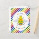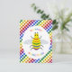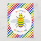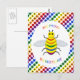 Esta postal presenta una imagen de diseño gráfico de color arcoiris de una abeja. La abeja tiene un cuerpo amarillo con ojos negros, piernas y antenas y 5 rayas en su vientre, una en rojo, naranja, verde, azul y púrpura. Hay un texto de color arcoiris alrededor de la abeja que dice "Sé orgulloso de ser el que eres" También hay una selección de flores de color arcoiris en el fondo.