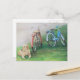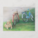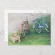 Esta postal muestra una reproducción de mi pintura original de lápiz acrílico y coloreado de un laboratorio amarillo y de bicicletas.