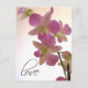 Orquídeas moradas suaves contra un fondo crema con amor en el tipo de letra del guión. Postal perfecta para duchas de boda, guardar la fecha, invitaciones de compromiso y más.
