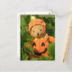 Esta tarjeta muestra la fotografía de un lindo Oso de Teddy vestido con un traje de calabaza. Está rodeado de enormes hojas verdes en un parche de calabaza. Disfruta de la temporada de Halloween y otoño con este lindo oso marrón disfrutando de un día soleado de otoño en el parche de calabaza.