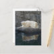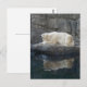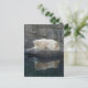 Una hermosa fotografía de un oso polar sobre una cornisa rocosa junto a un arroyo con su imagen reflejada en el agua.