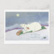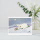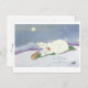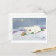 Un oso polar está parando en una colina nevada, con montañas violetas en el fondo. También verás el sol y la luna. Alrededor del cuello, el oso lleva un collar de Navidades con un hombre de jengibre y un bastón de dulces.