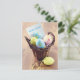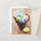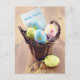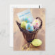 Ostereier en einem Korb mit Notizzettel. Frohe Ostern.