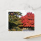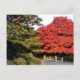 El pino rojo contrasta con un gran arce japonés escarlata sobre un pequeño puente