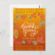 Hojas de otoño coloridas con tipografía blanca sobre fondo naranja quemado, terracota y amarillo gradiente y nombre de la familia para personalizar. Perfecto para un maravilloso saludo para familiares y amigos durante las fiestas de Acción de Gracias.