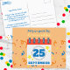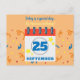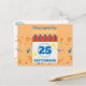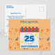 ¡Celebra un día especial con nuestra vibrante y personalizable postal de cumpleaños! Este diseño cuenta con un estilo gráfico juguetón y festivo, perfecto para marcar hitos memorables. En el corazón de la postal hay una encantadora ilustración de un calendario, con una fecha específica rodeada para honrar el gran día de la persona que cumple años. El número '25' se muestra de manera prominente dentro de un círculo, simbolizando la fecha, mientras que el mes 'SEPTIEMBRE' se deletrea en negrita y letras mayúsculas debajo.