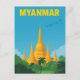 Un vibrante cartel de viaje al estilo vintage que muestra las icónicas pagodas doradas de Myanmar. La ilustración presenta estupas impresionantes que brillan bajo un cielo azul claro, elevándose sobre un exuberante paisaje de selva verde. Las palmeras y las aves en vuelo añaden a la atmósfera serena y tropical. Este diseño retro es perfecto para aquellos que aman viajar, la cultura del sudeste asiático y la arquitectura única. Evoca una sensación de tranquilidad espiritual y aventura, lo que lo convierte en una hermosa pieza de arte para cualquier hogar u oficina.