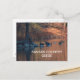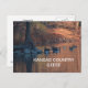 El canadiense Geese disparó cerca con la puesta de sol brillando en el agua, con árboles y rocas cerca de la orilla. Eso está en una TARJETA POST.