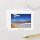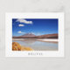 Postal de un paisaje con un volcán nevado reflejado en un lago y hierba amarilla en el desierto de Atacama cerca de Uyuni en la frontera entre Bolivia y Chile en la altitud del Altiplano en las montañas andinas con una frontera blanca y el texto: 'Bolivia'.