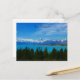 Postal de la Isla del Sur de Nueva Zelanda con espectaculares montañas surgiendo de un lago azul cristalino y árboles.