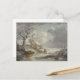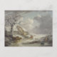 Un paisaje invernal representa una campiña cubierta de nieve, con árboles estériles y una casita de campo con techo de paja. La gente se dedica a actividades alrededor de un estanque congelado, mientras los caballos se paran cerca bajo un cielo nublado. Artista: George Morland