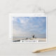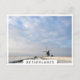 Foto postal de una visión minimalista de un paisaje invernal en Holanda con un camino y un canal hacia un molino de viento bajo una capa de nieve con bonitas nubes al amanecer en el campo holandés con un borde blanco y en una caja blanca el texto 'Países Bajos'.