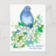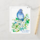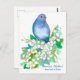 Postal decorada con un pájaro volador de una sirena sobre una sirena, naranja burlón, arbusto florido pintado con acuarela. El diseño está inspirado en el ave estatal y la flor estatal de Idaho.